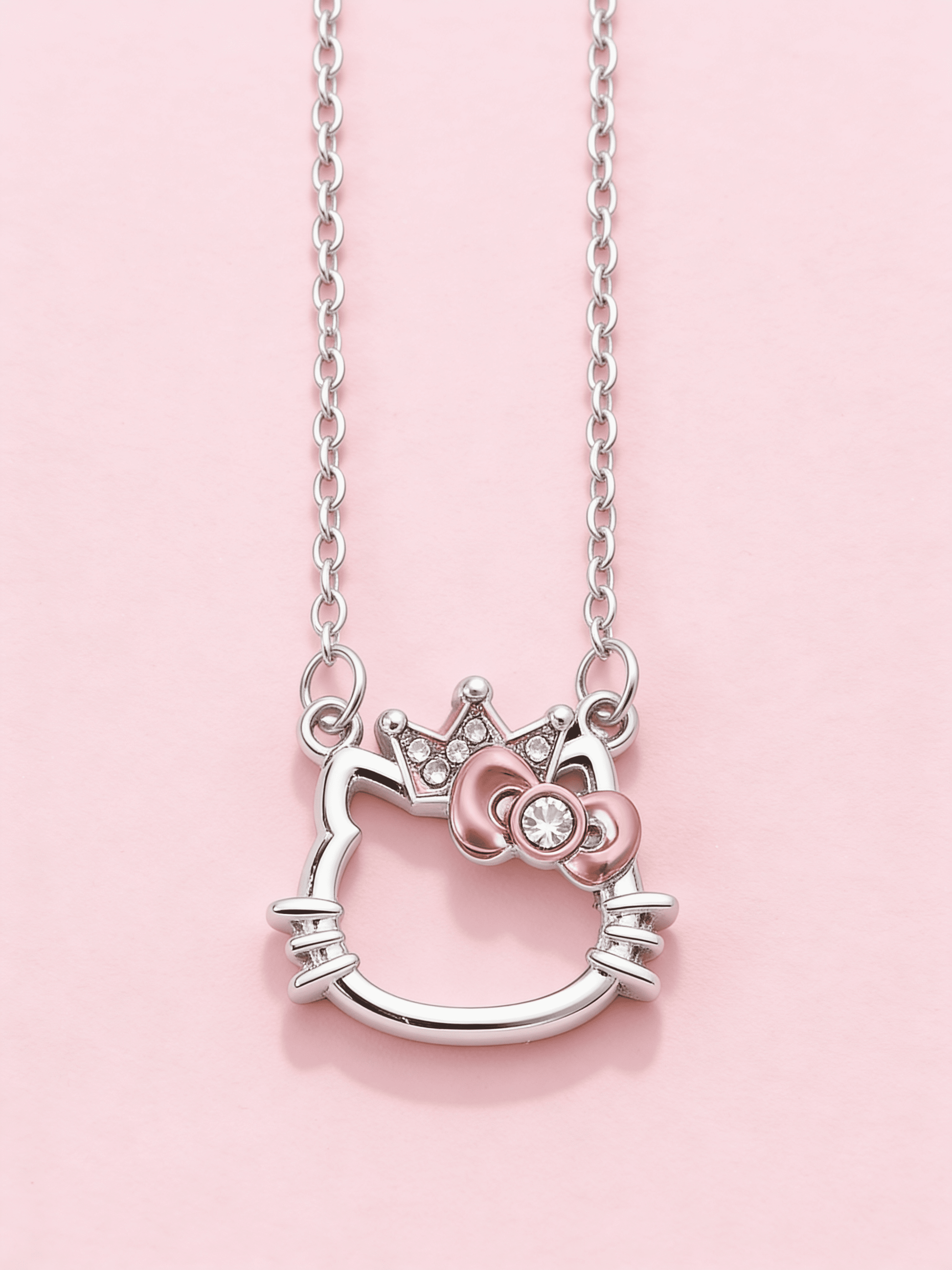 Elegantný náhrdelník s motívom Hello Kitty je dokonalým doplnkom pre každého fanúšika tejto ikonickej postavičky. Jemná strieborná retiazka je zakončená príveskom v tvare hlavy Hello Kitty, ozdobeným drobnými, trblietavými kamienkami, ktoré dodávajú náhrdelníku luxusný vzhľad. Tento štýlový kúsok je ideálny na každodenné nosenie aj špeciálne príležitosti, kedy chcete dodať svojmu outfitu trochu hravosti a elegancie.